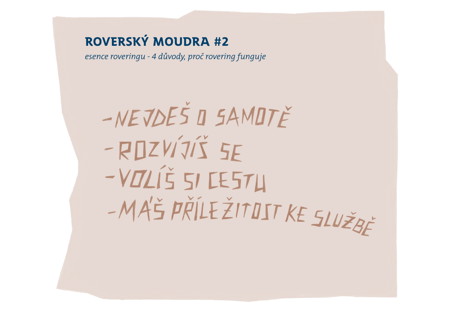 K tomu dobře slouží „Podstata roveringu“, která svými čtyřmi body přibližuje, co lze od roverské výchovy očekávat. Může být pro tebe vodítkem v situaci, když se tě třeba někdo, kdo s roveringem začíná, zeptá, jak že ten rovering vlastně vypadá, a na vysvětlení máš jen pár minut.